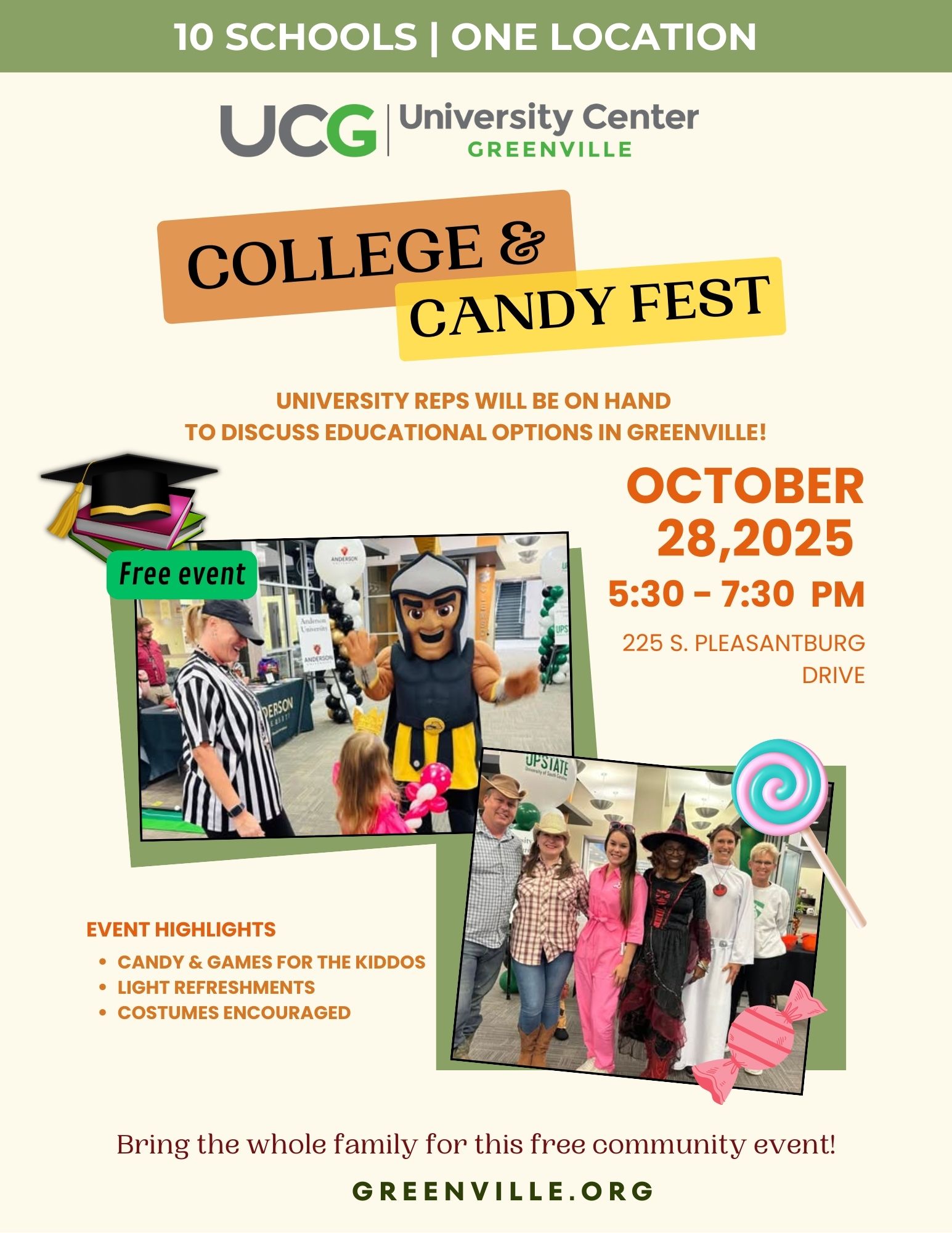 On Tuesday, October 28th, UCG will be hosting the 4th Annual College and Candy Fest – a fun, low-pressure event that will allow you to discuss higher education options in Greenville from ten distinguished and accredited colleges and universities.